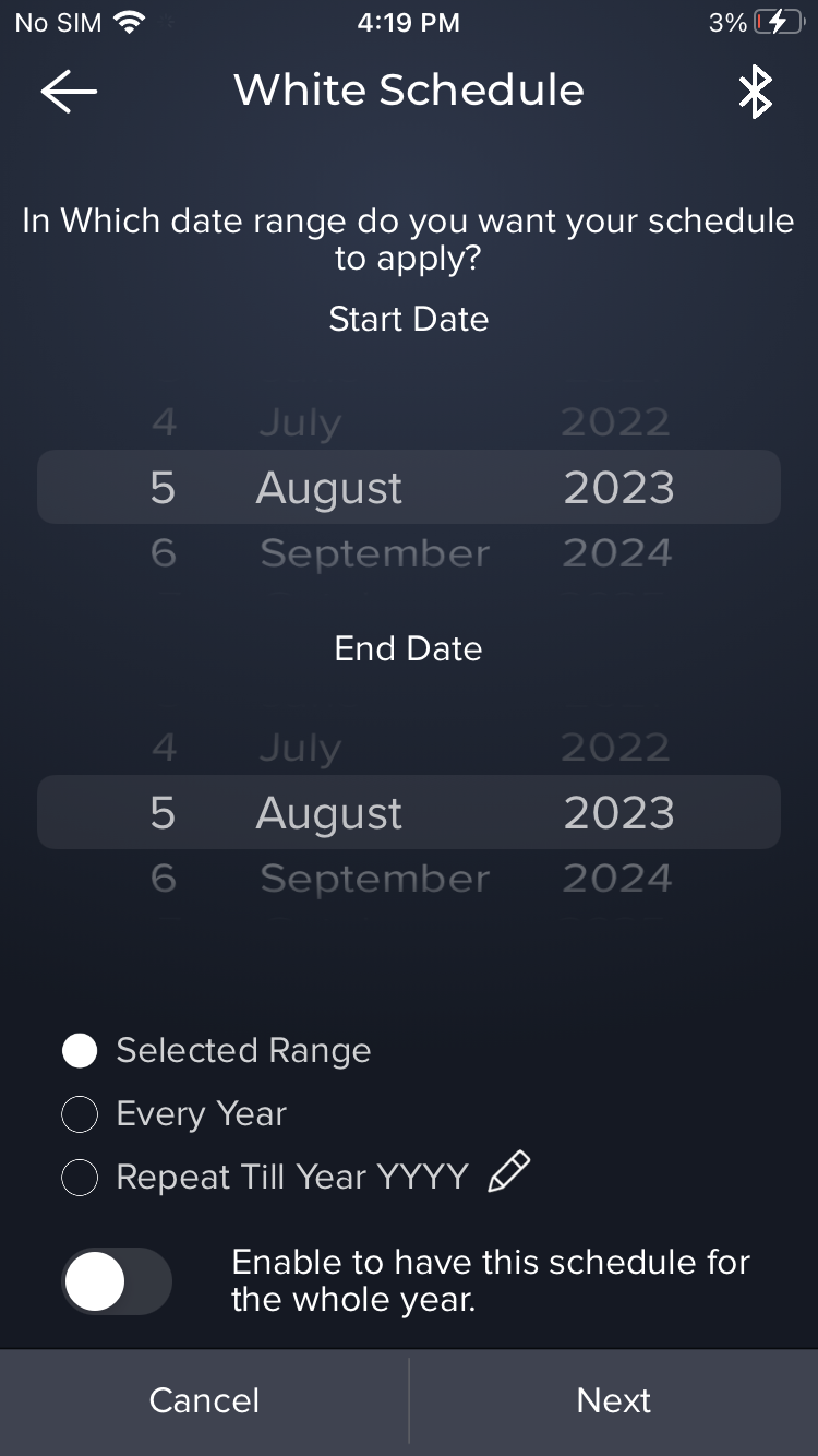 - Select the desired date range and tap “Next.” Also select whether you want to repeat the scheduled action every year or until a few years in the future.