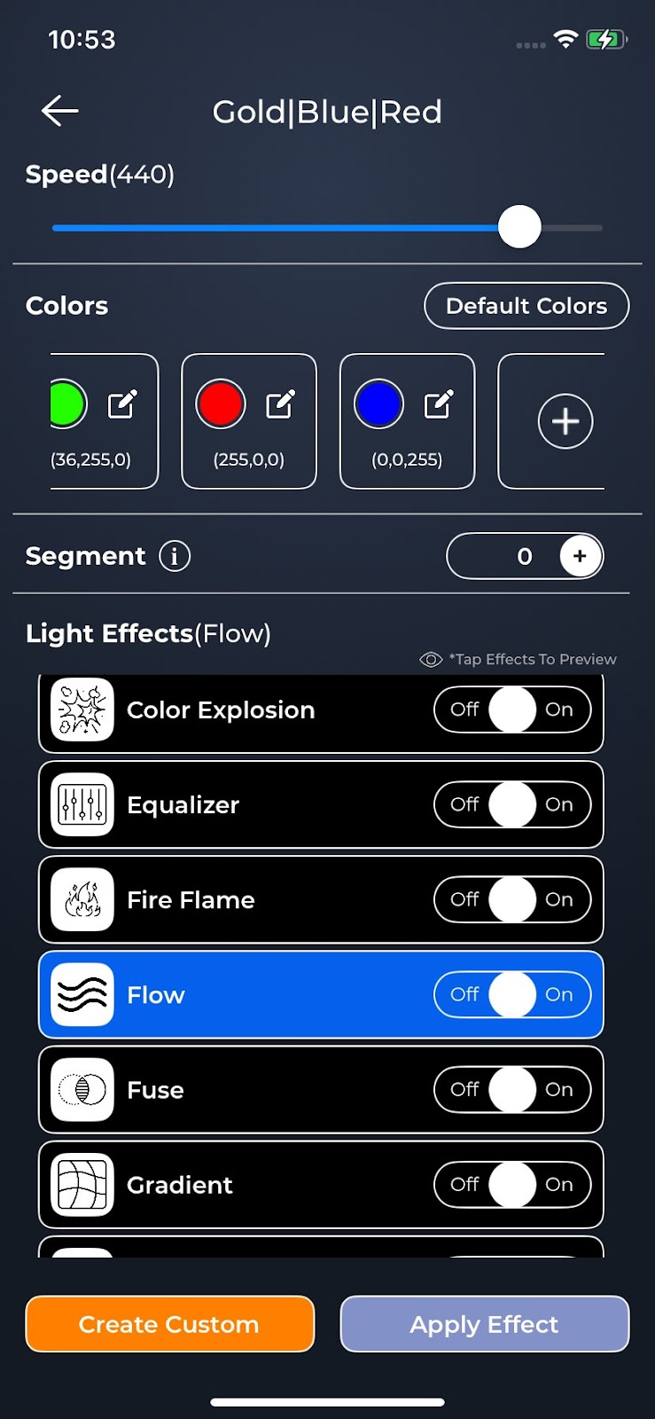 6. After selecting a team, you will see colors based on its name and different effect options with toggle buttons below.