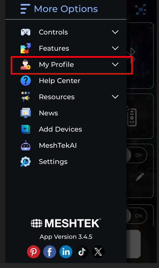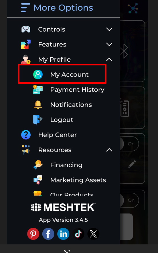 - Log in into your app. To fill the installer form on your account, click on the 3 lines at the top left of your screen, select "My Profile", then on "My Account".