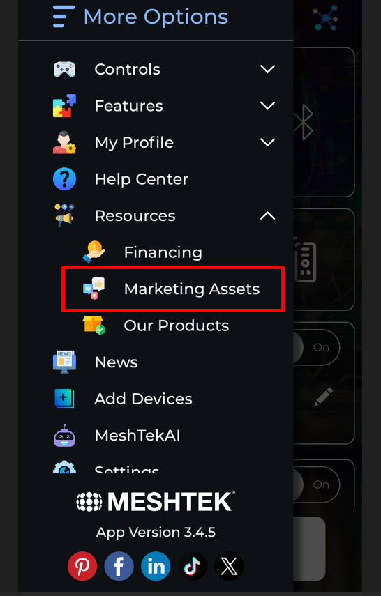 - For downloading Co-Branded Assets click on the 3 lines more option slider at the top left of your screen, and select "Resources", then on "Marketing Assets".
