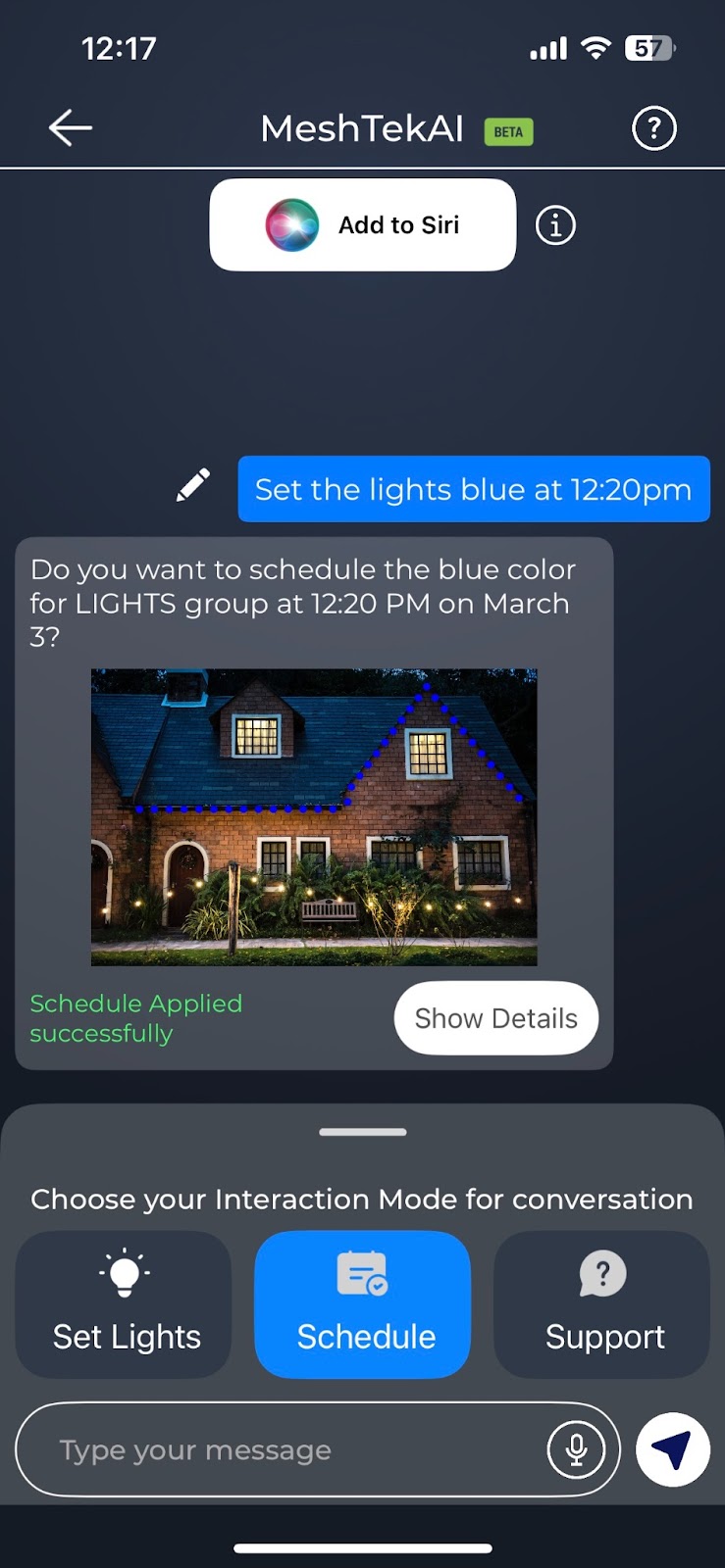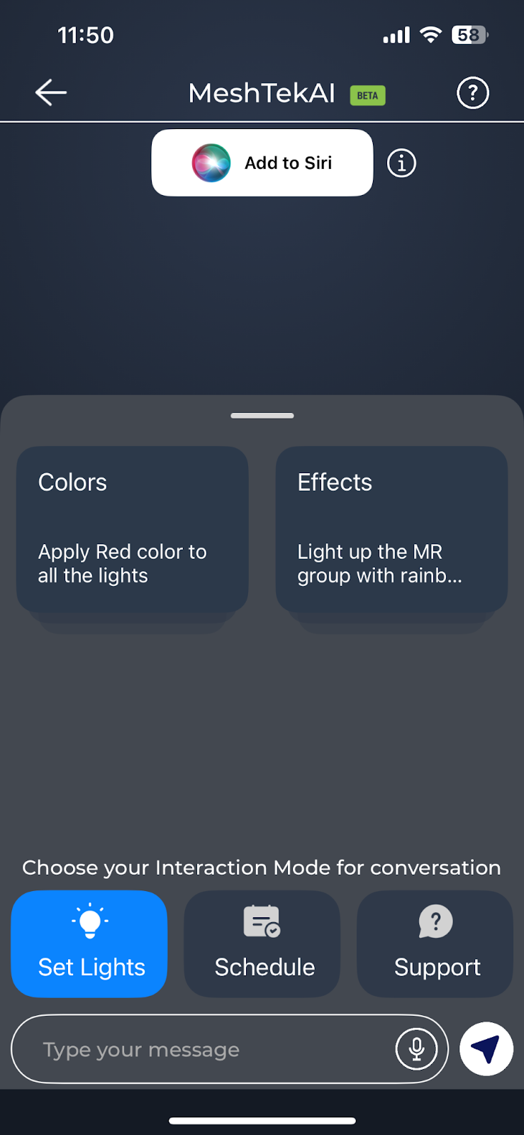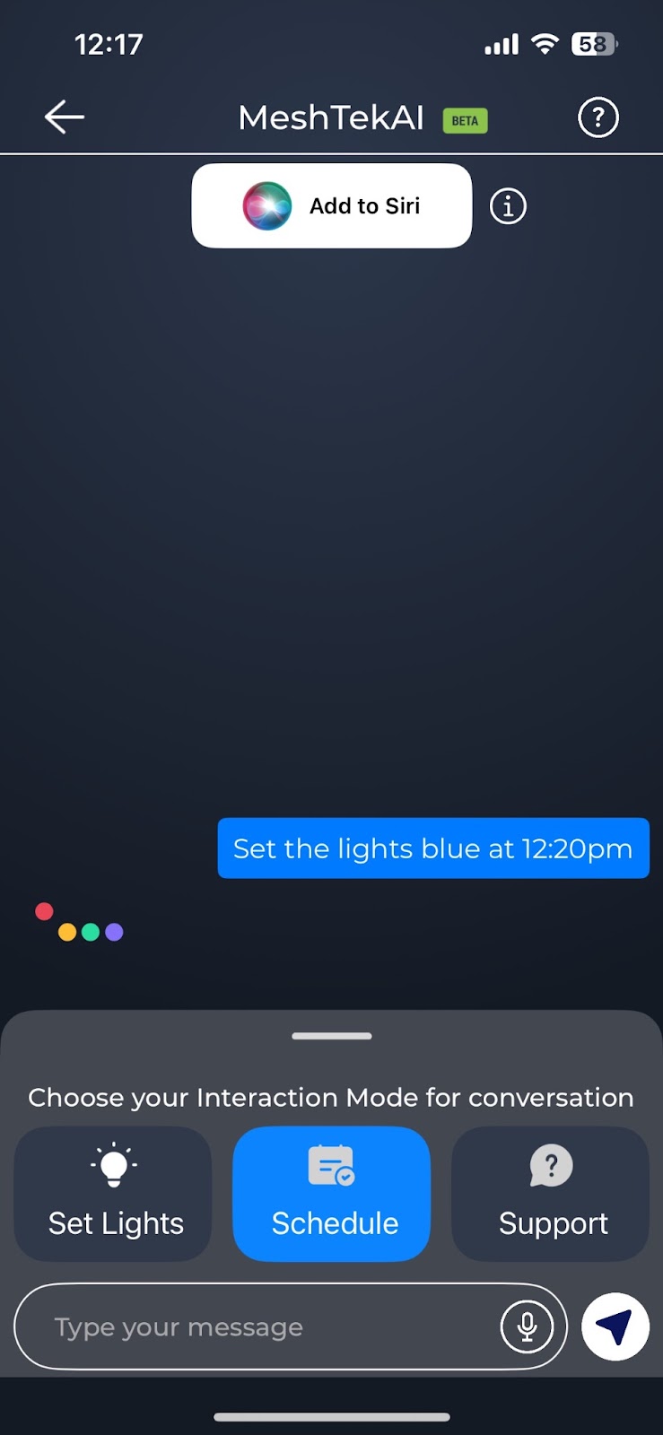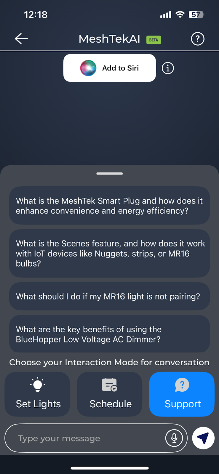- Navigate to the MeshTekAI from the Left Side Drawer Menu to access the three modules: Support, Set Lights, and Schedule.