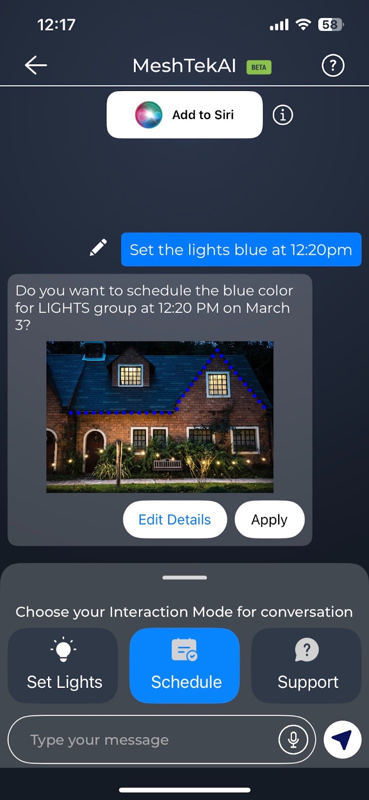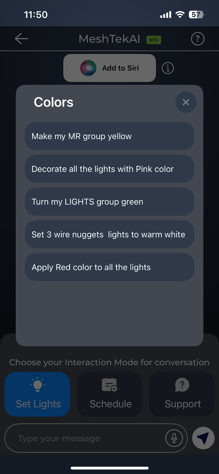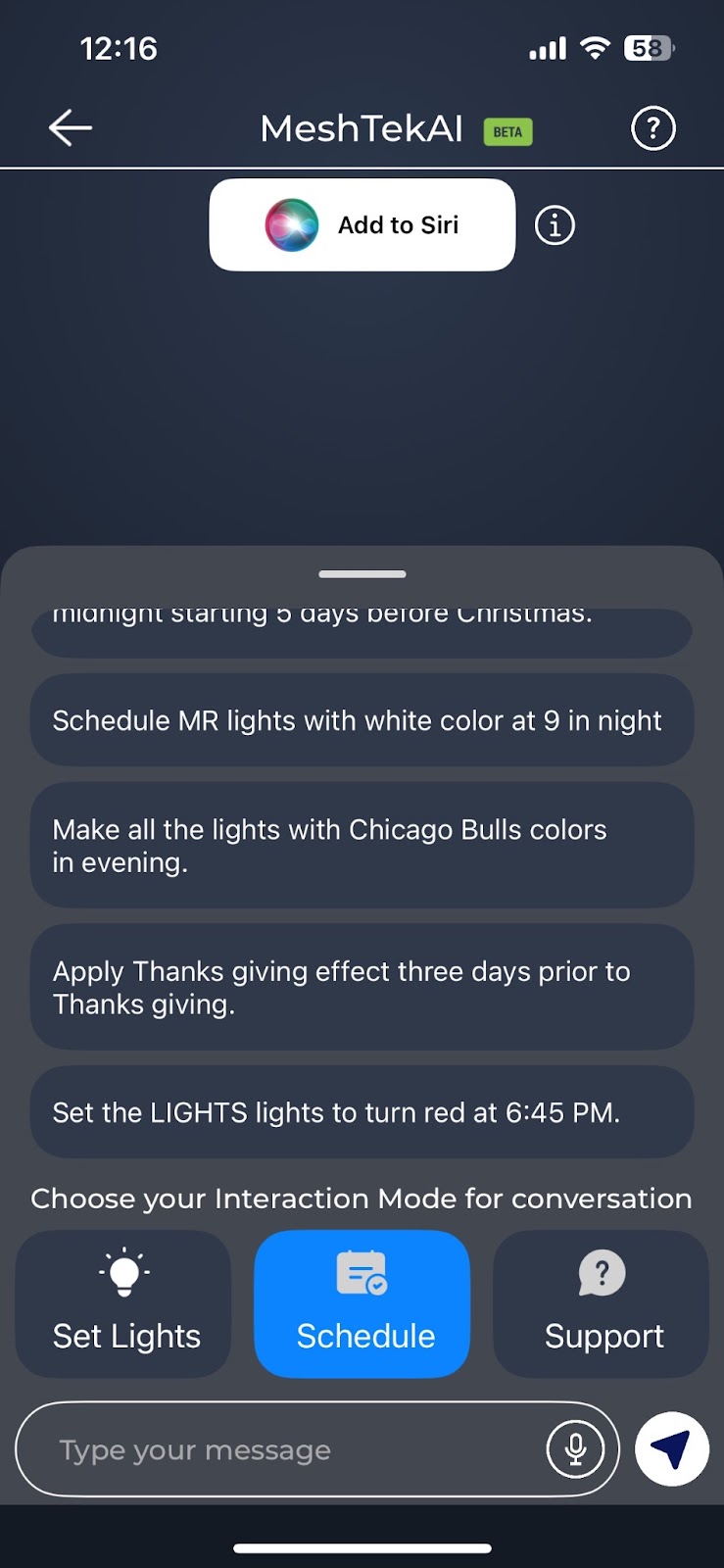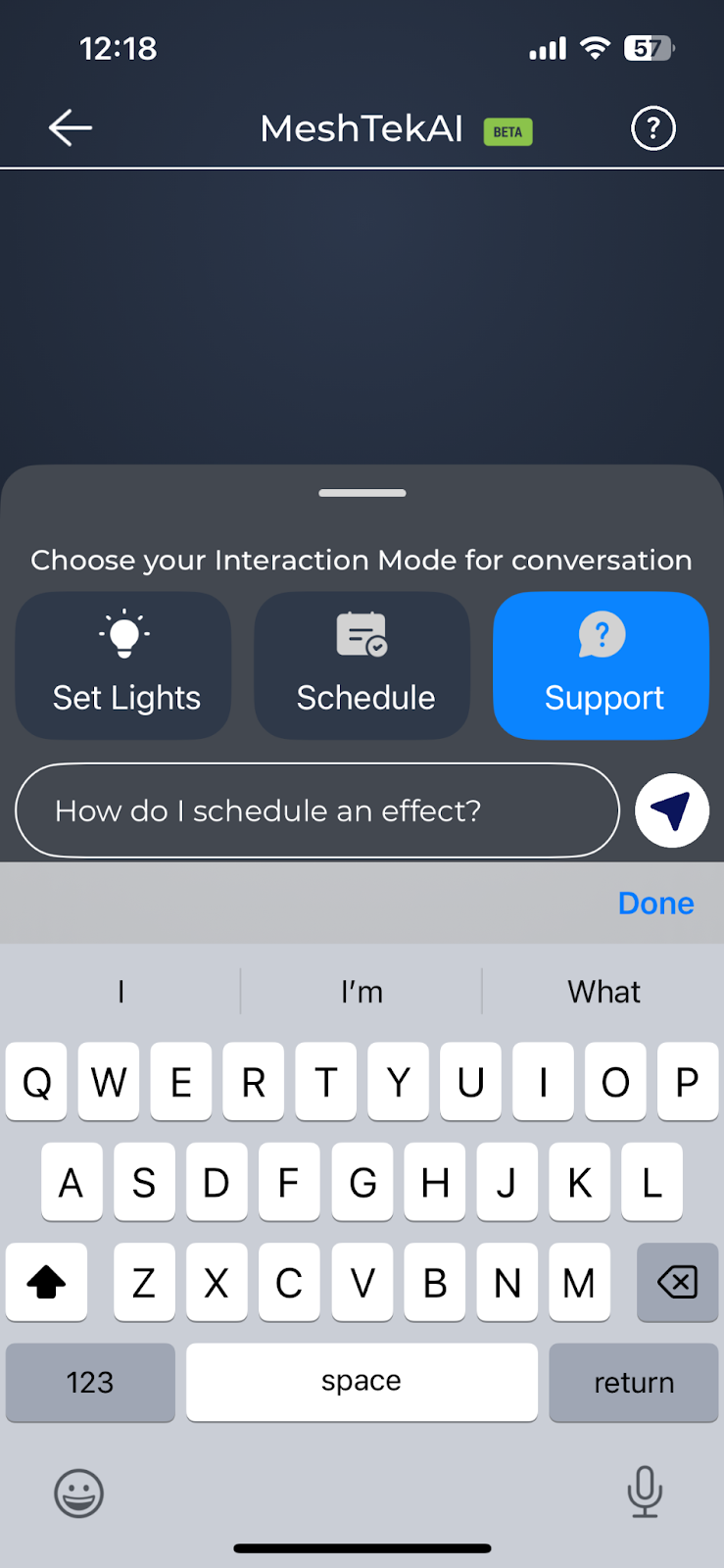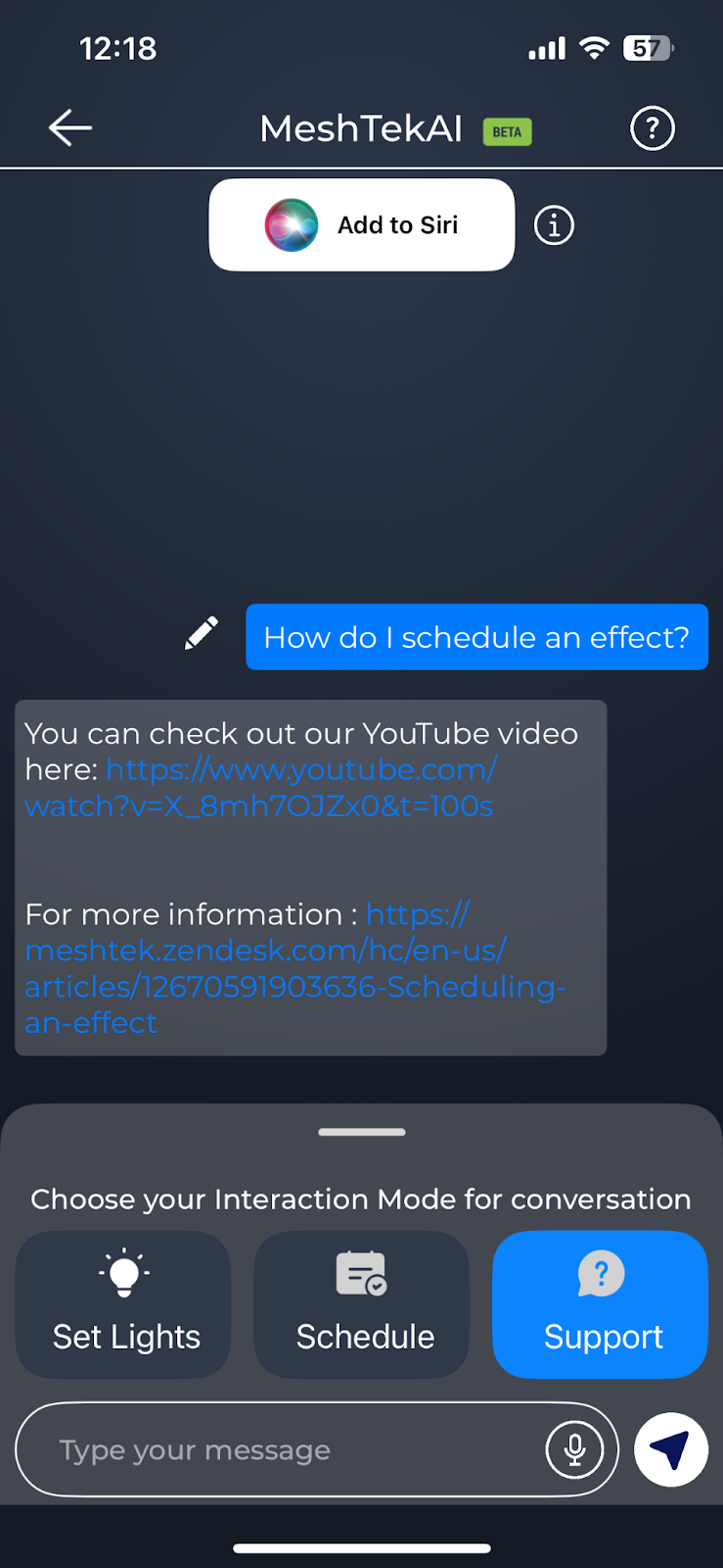 - Navigate to the MeshTekAI from the Left Side Drawer Menu to access the three modules: Support, Set Lights, and Schedule.