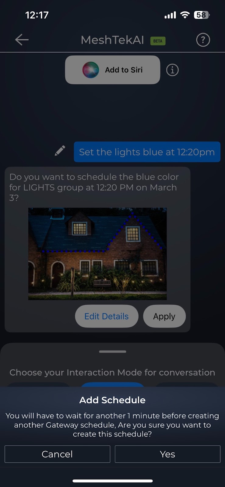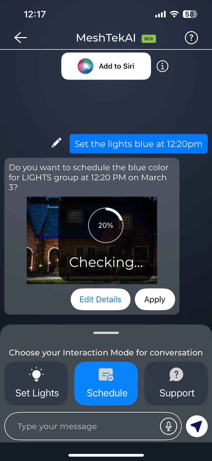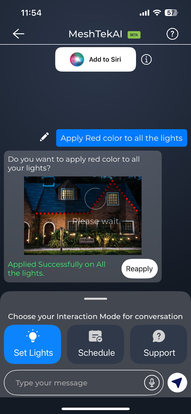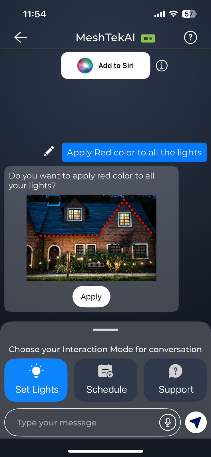 - Navigate to the MeshTekAI from the Left Side Drawer Menu to access the three modules: Support, Set Lights, and Schedule.