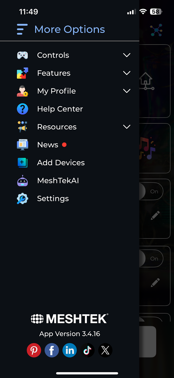 MeshTekAI is designed to enhance your outdoor lighting experience by integrating smart controls through a user-friendly interface. With MeshTekAI, you can access support resources, customize lighting settings, and schedule automated displays, all from your smartphone or compatible device. This manual explains how to use each module effectively to get the most out of your IoT lighting system.