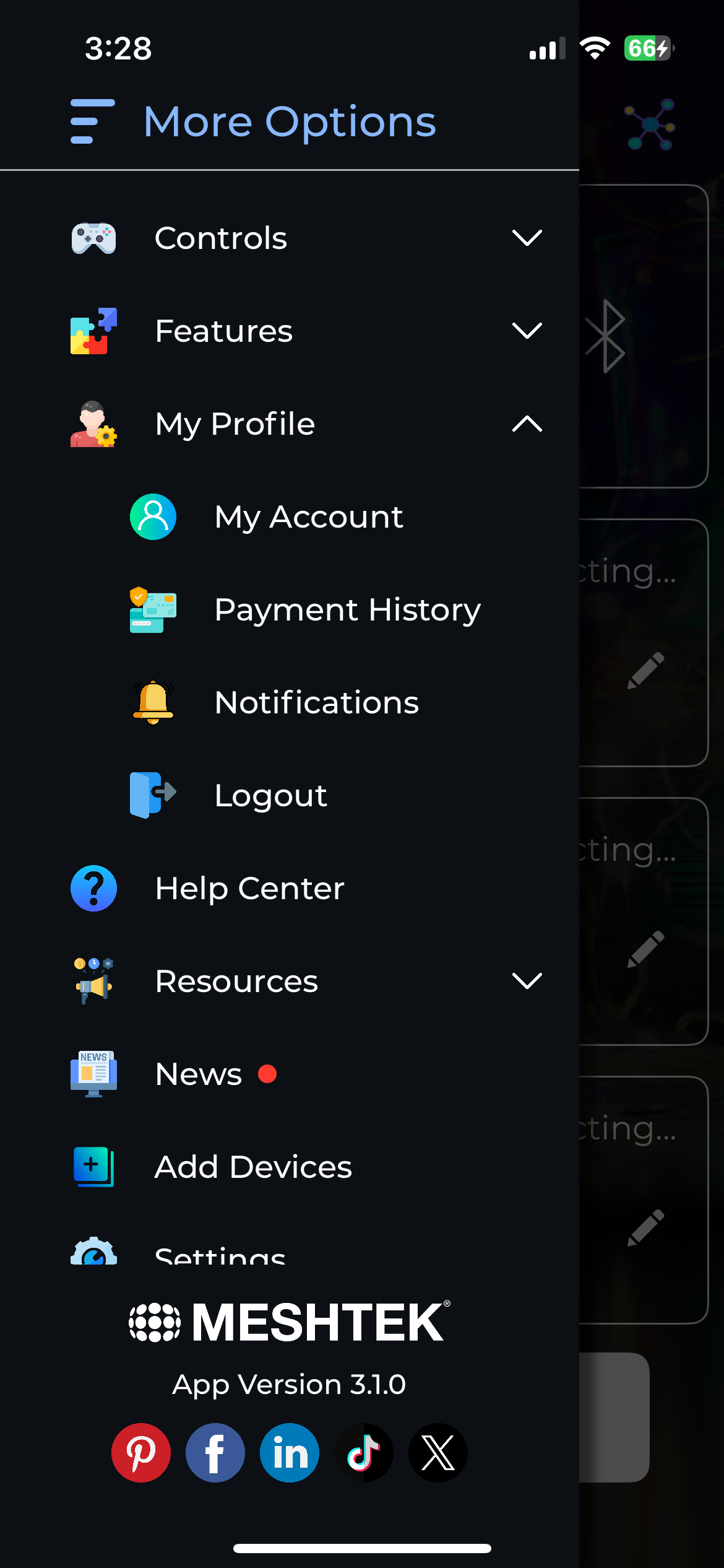 (1) In order for someone to invite you to access their Meshtek network, you’ll first need to create an account in the app. If you already have an account, simply log into your app. When you login, you’ll find that you don’t have any devices paired yet! Don’t fret, you’ll have them soon. Click on the 3 lines at the top left of your screen, and select "My Account".