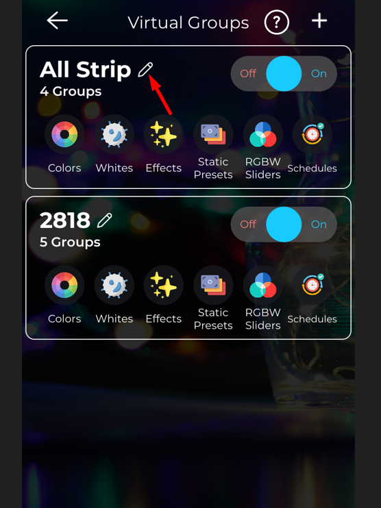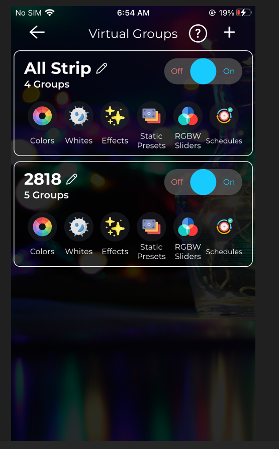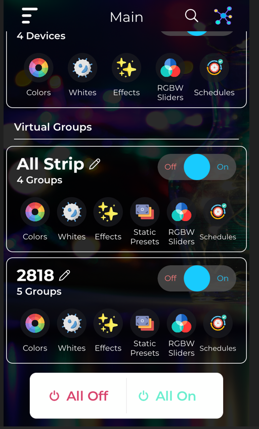 The Virtual Groups feature allows you to manage multiple light groups simultaneously through a single interface. You can control colors, whites, effects, and scheduling with ease.