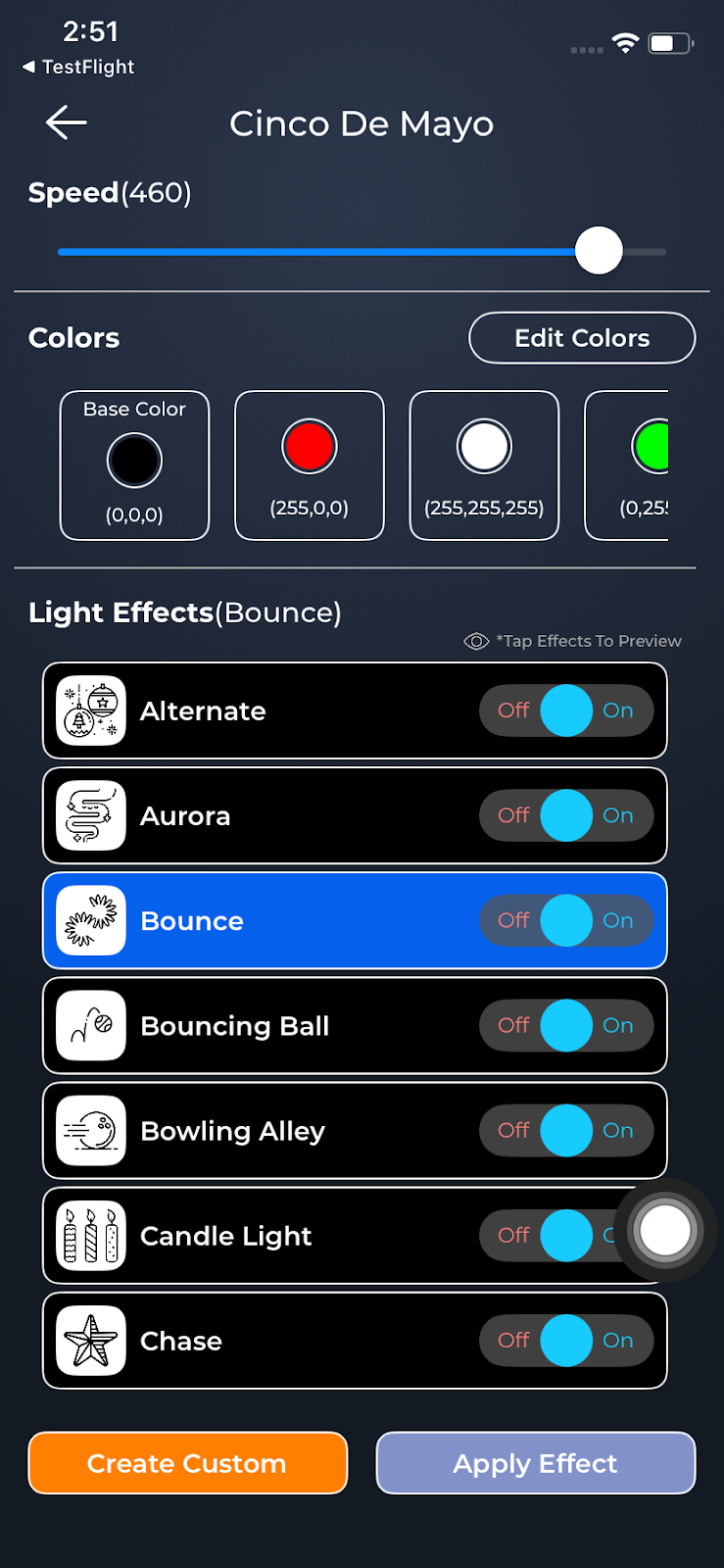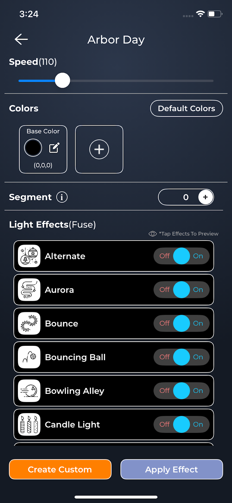 - Once you pick a style, you'll see colors that match its name. Below, there are different ways the lights can move or change, with on/off switches next to them.