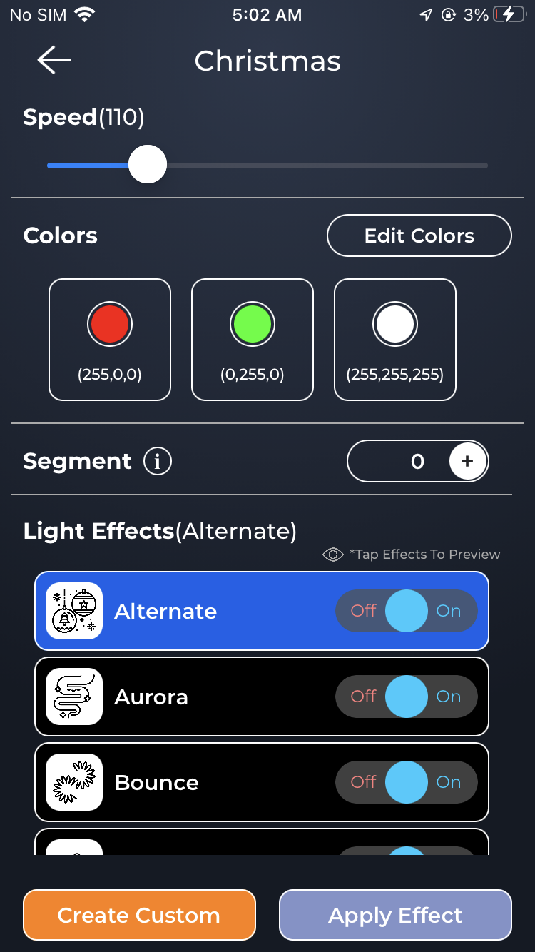 - Select Effect: Choose available effects (e.g. Aurora, Bounce) and turn them toggle ON/OFF.