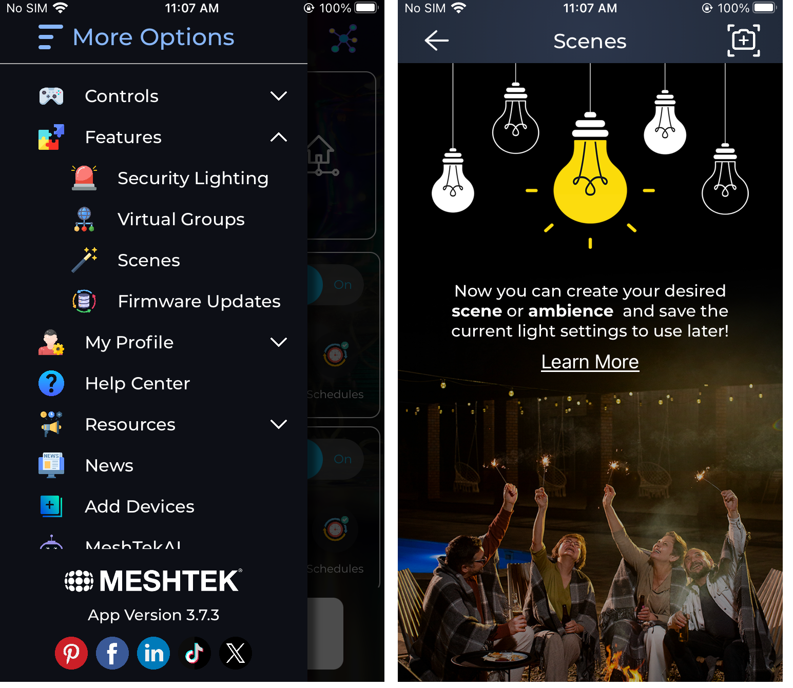 - To create a new scene you need to first apply any colors/Effects from the side menu as you normally would. Scenes will save the settings of all networked Bluehopper/Meshtek devices as one entity that can be individually named and scheduled.