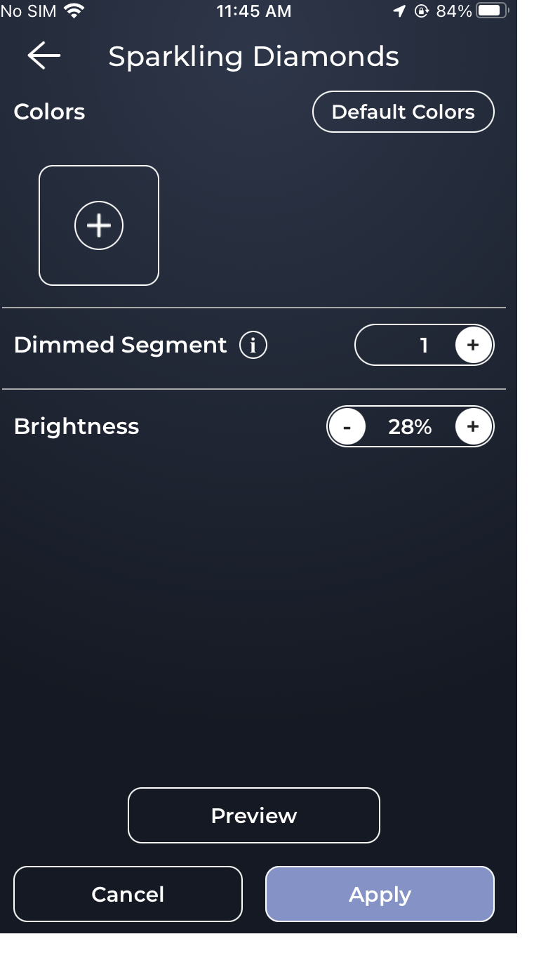 In the Sparkling Diamonds static presets you can edit color, set dimmed segment, set brightness, view preview and apply.