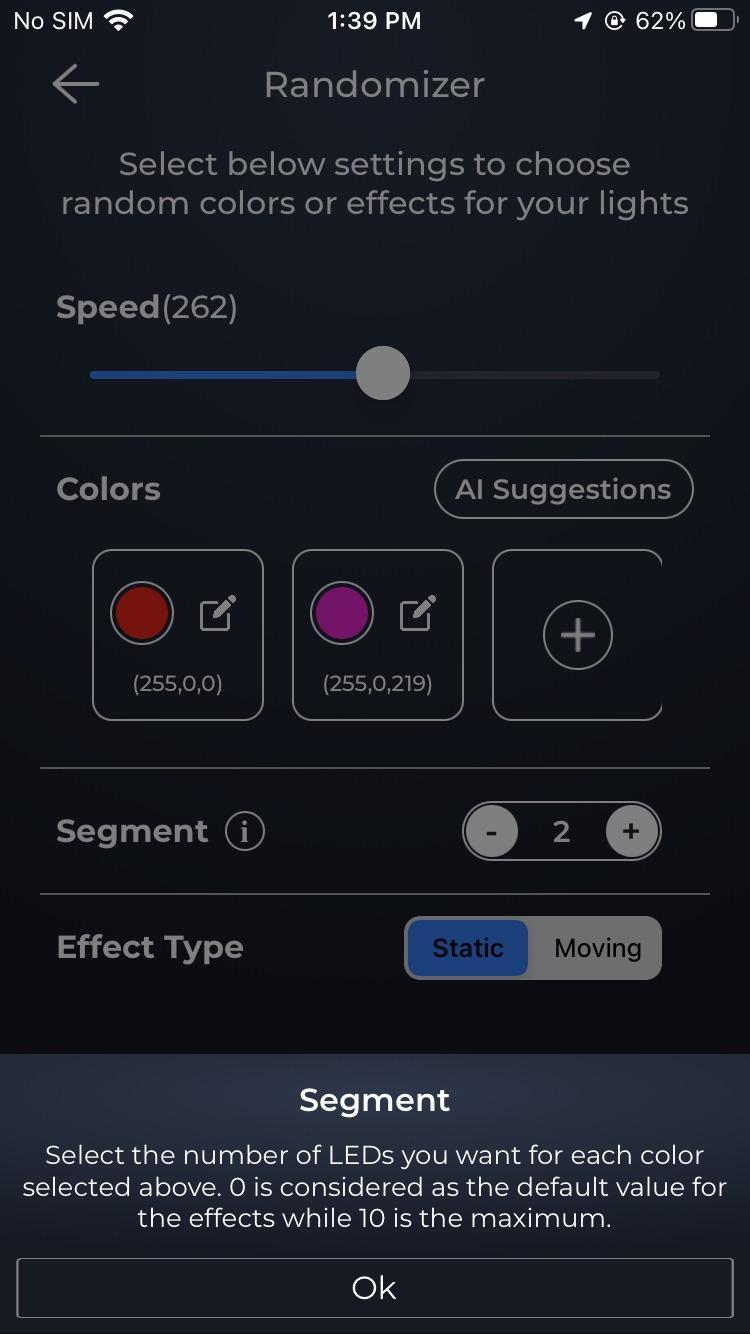 Select segment of your choice. 0 is the default value for effects and 10 is the maximum.