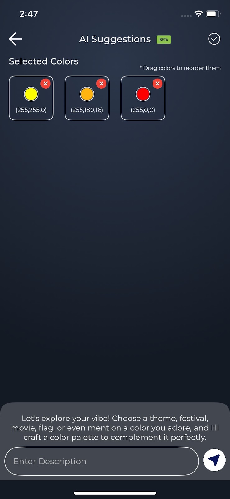 5. In the 'AI Suggestions' feature, the user can ask for any color. The AI will find and show that color. If you like it, you can add it to your color list.
