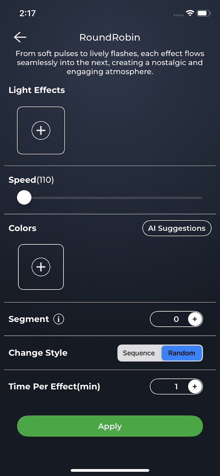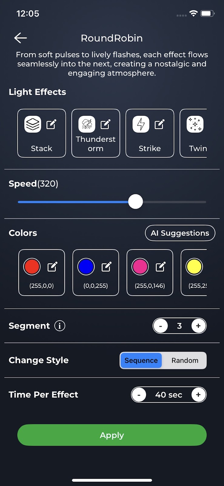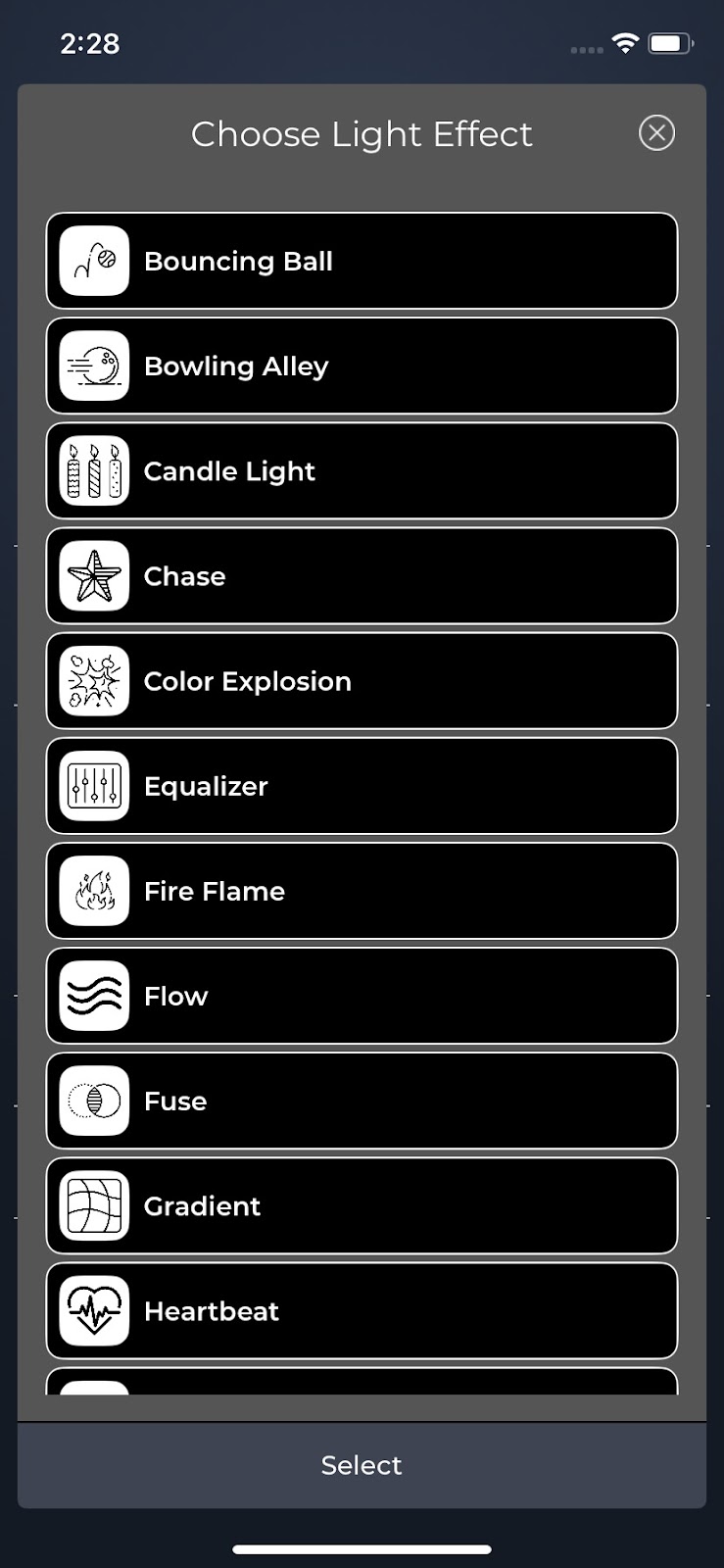 → New feature! You can now select multiple effects to play one after another (round robin). This option shows up when your strips are connected to the app. To use this new feature :